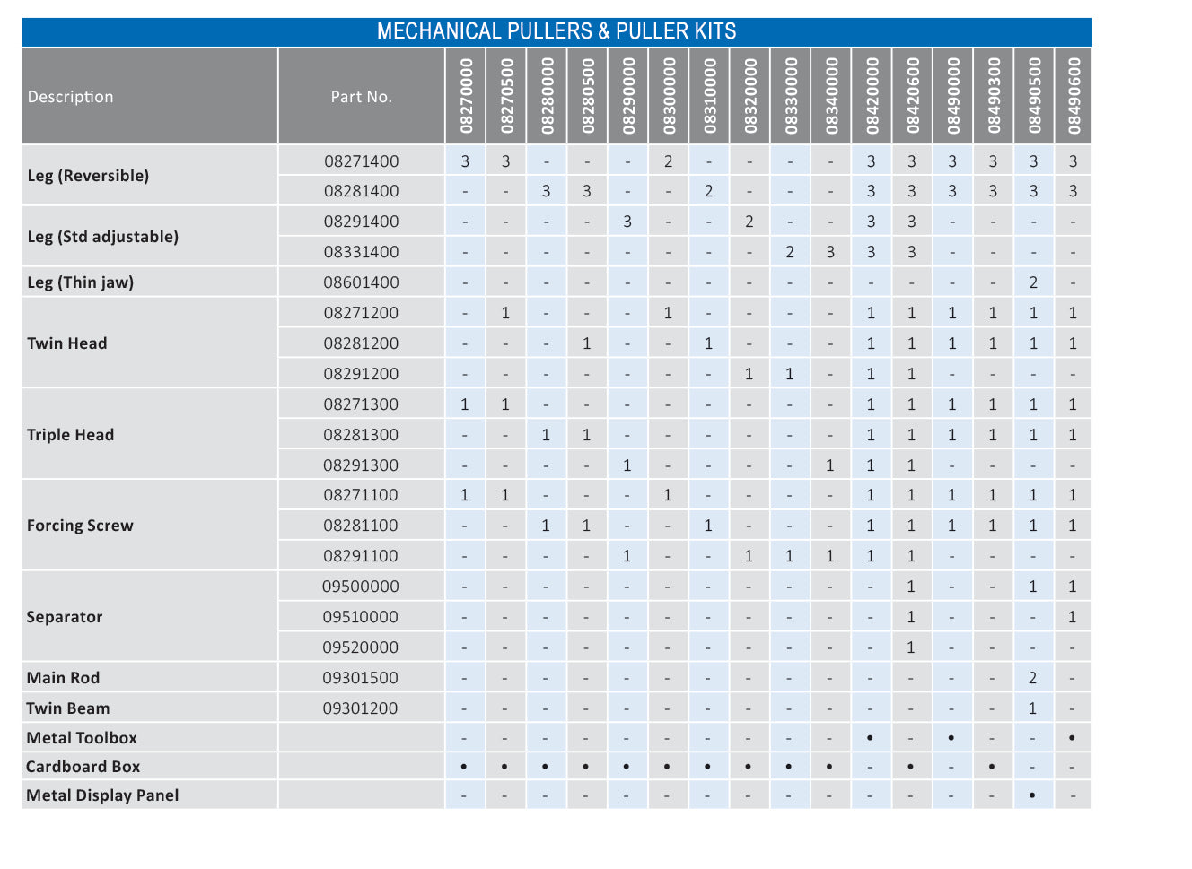 See puller components illustrations and kit content tables for more details on spares